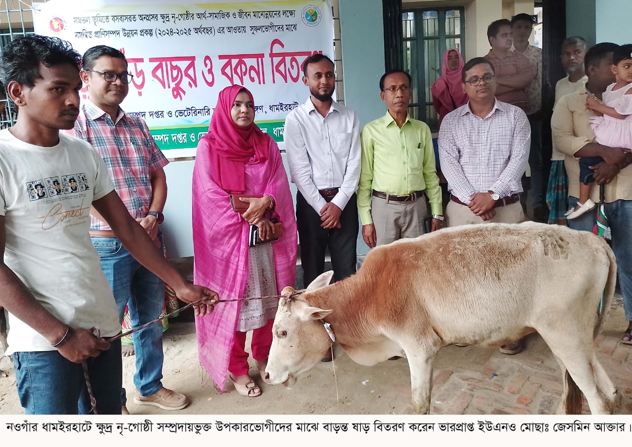 নওগাঁর ধামইরহাটে ক্ষুদ্র নৃ-গোষ্ঠির মাঝে ষাঁড় গরু বিতরণ করা হয়েছে। সমতল ভূমিতে বসবাসরত অনগ্রসর ক্ষুদ্র নৃ-গোষ্ঠির আর্থ সামাজিক ও জীবন মানোন্নয়নের লক্ষে সমন্বিত প্রাণিসম্পদ উন্নয়ন প্রকল্পের আওতায় নির্বাচিত সুফল ভোগীদের মধ্যে গরু হৃষ্টপুষ্টকরণ প্যাকেজ ও বকনা প্যাকেজের আওতায় ষাঁড় গরু বিতরণ করা হয়। উপজেলা প্রাণিসম্পদ অফিস চত্বরে ২০মে বেলা ১১টায় উদ্বোধনী পর্যায়ে ২০ জনকে বাড়ন্ত ষাঁড় বিতরণ কার্যক্রমের উদ্বোধন করেন ভারপ্রাপ্ত উপজেলা নির্বাহী অফিসার মোছাঃ জেসমিন আক্তার। এ সময় উপস্থিত ছিলেন উপজেলা প্রাণিসম্পদ অফিসার ডা. ওয়াজেদ আলী, কৃষি অফিসার কৃষিবিদ মো. তৌফিক আল জুবায়ের, প্রাণিসম্পদ সম্প্রসারণ অফিসার রিপন রেজা, সমাজসেবা কর্মকর্তা এ টি এম ফসিউল আলম, উপ-সহকারি প্রাণিসম্পদ কর্মকর্তা আল মামুনুর রশিদ (সম্প্রসারণ) প্রমূখ।