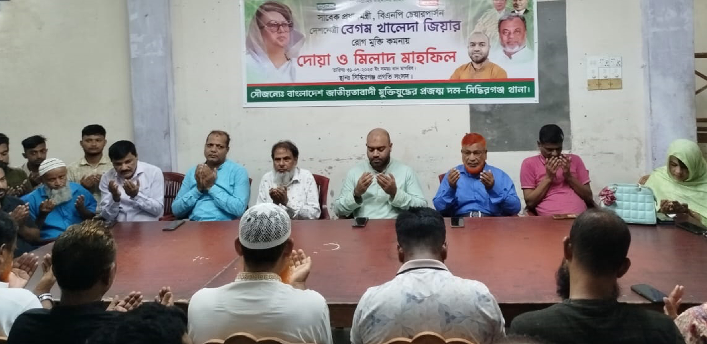 সাবেক প্রধানমন্ত্রী বিএনপির চেয়ারপারসন বেগম খালেদা জিয়ার রোগমুক্তি কামনায় বাংলাদেশ জাতীয়তাবাদী মুক্তিযুদ্ধের প্রজন্ম দল সিদ্ধিরগঞ্জ থানা শাখার উদ্যোগে দোয়া মাহফিল অনুষ্ঠিত হয়েছে। বৃহস্পতিবার (৩১ জুলাই) বাদ মাগরিব সিদ্ধিরগঞ্জ প্রগতি সংসদ কার্যালয়ে উক্ত দোয়া মাহফিল অনুষ্ঠিত হয়।