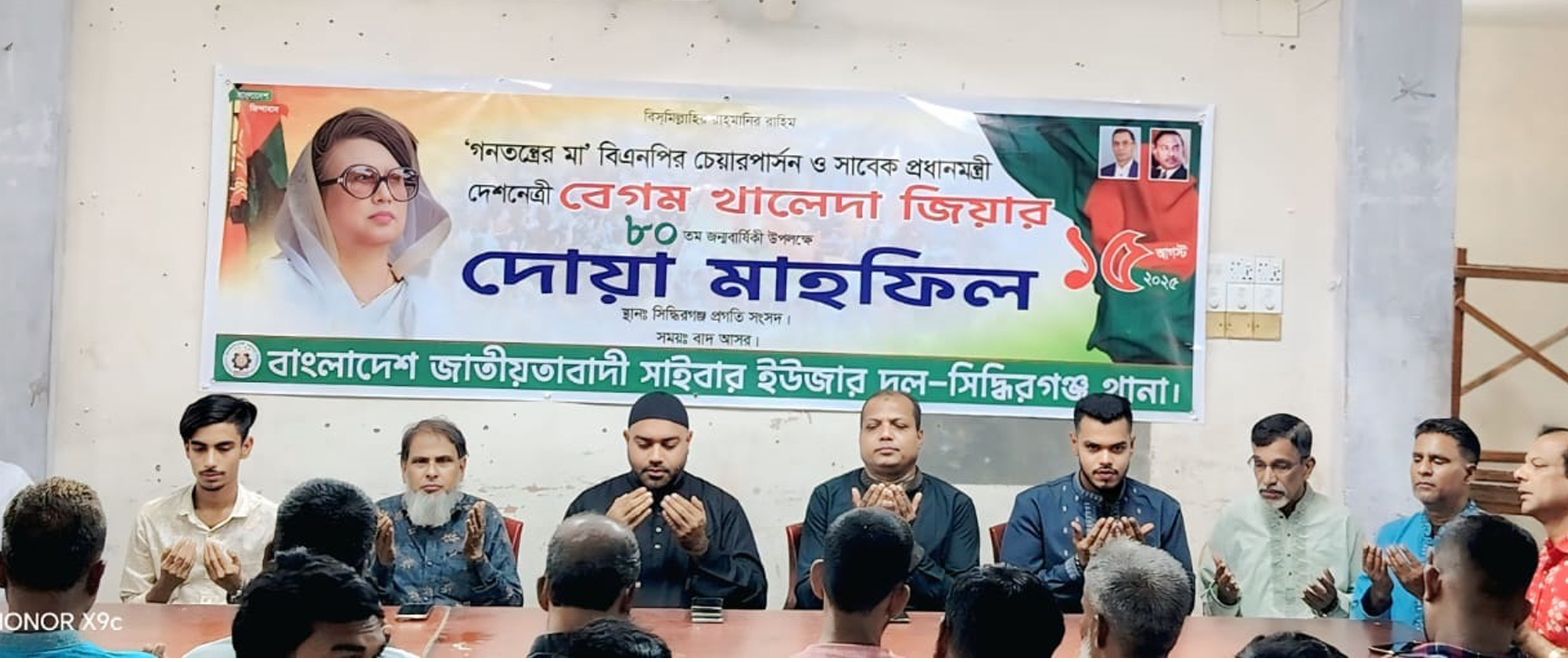 বিএনপি চেয়ারপারসন ও সাবেক প্রধানমন্ত্রী বেগম খালেদা জিয়ার ৮১তম জন্মবার্ষিকী উপলক্ষে দোয়া ও মিলাদ মাহফিল করেছে বাংলাদেশ জাতীয়তাবাদী সাইবার ইউজার দল সিদ্ধিরগঞ্জ থানা শাখা । শুক্রবার (১৫ আগস্ট) বাদ আসর নাসিক ৫নং সিদ্ধিরগঞ্জ প্রগতি সংসদ কার্যালয়ে দোয়া মাহফিল অনুষ্ঠিত হয়।