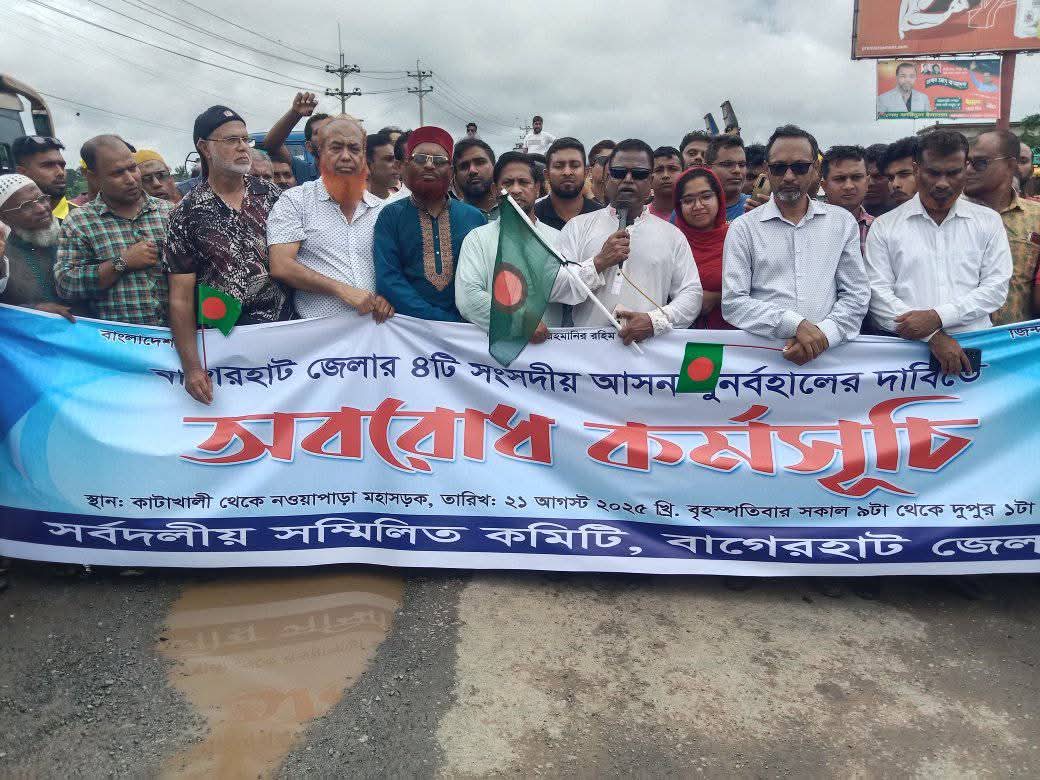 বাগেরহাট জেলার ৪টি সংসদীয় আসন থেকে কেটে ৩টি করার প্রতিবাদে খুলনা-মংলা ও মাওয়া-খুলনা মহাসড়কের কাটাখালী ও নওয়াপাড়া মোড়ে সর্বদলীয় সম্মিলিত কমিটির ব্যানারে সড়ক অবরোধ, বিক্ষোভ মিছিল ও অবস্থান কর্মসূচি পালিত হয়েছে।