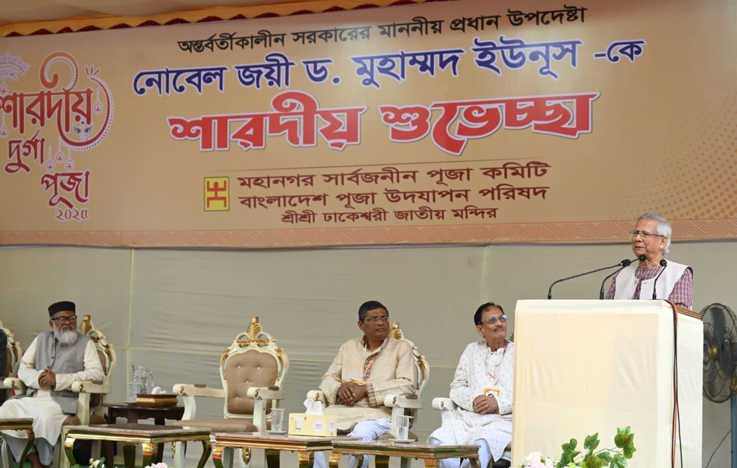 আজ (১৬ সেপ্টেম্বর) রাজধানীর ঢাকেশ্বরী জাতীয় মন্দিরে শারদীয় দুর্গাপূজা উপলক্ষে সনাতন হিন্দু ধর্মাবলম্বীদের সঙ্গে শুভেচ্ছা বিনিময় অনুষ্ঠানে প্রধান উপদেষ্টা এসব কথা বলেন। এর আগে তিনি ঢাকেশ্বরী মন্দির পরিদর্শন করেন।