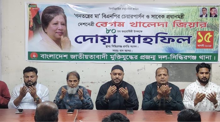 সিদ্ধিরগঞ্জে খালেদা জিয়ার জন্মবার্ষিকীতে মুক্তিযুদ্ধের প্রজন্ম দলের দোয়া মাহফিল